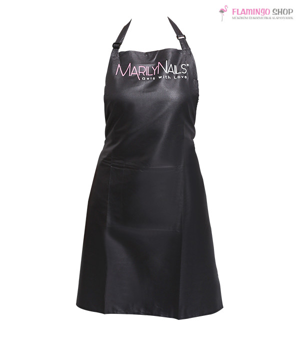 Portaszító és vízlepergető anyagú, sötét szürke színű, zsebes kötény, MarilyNails logóval. Állítható nyakpánttal.